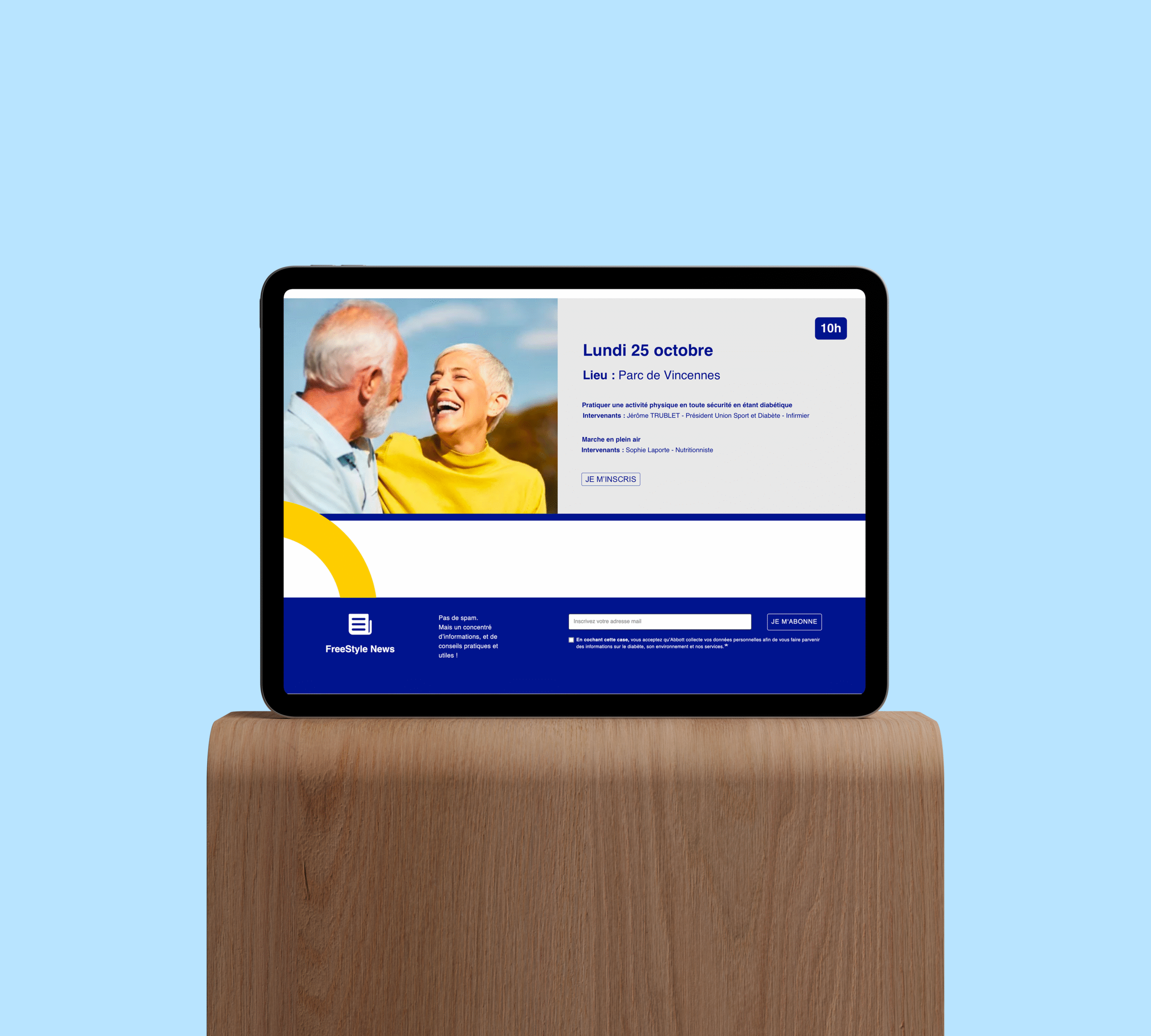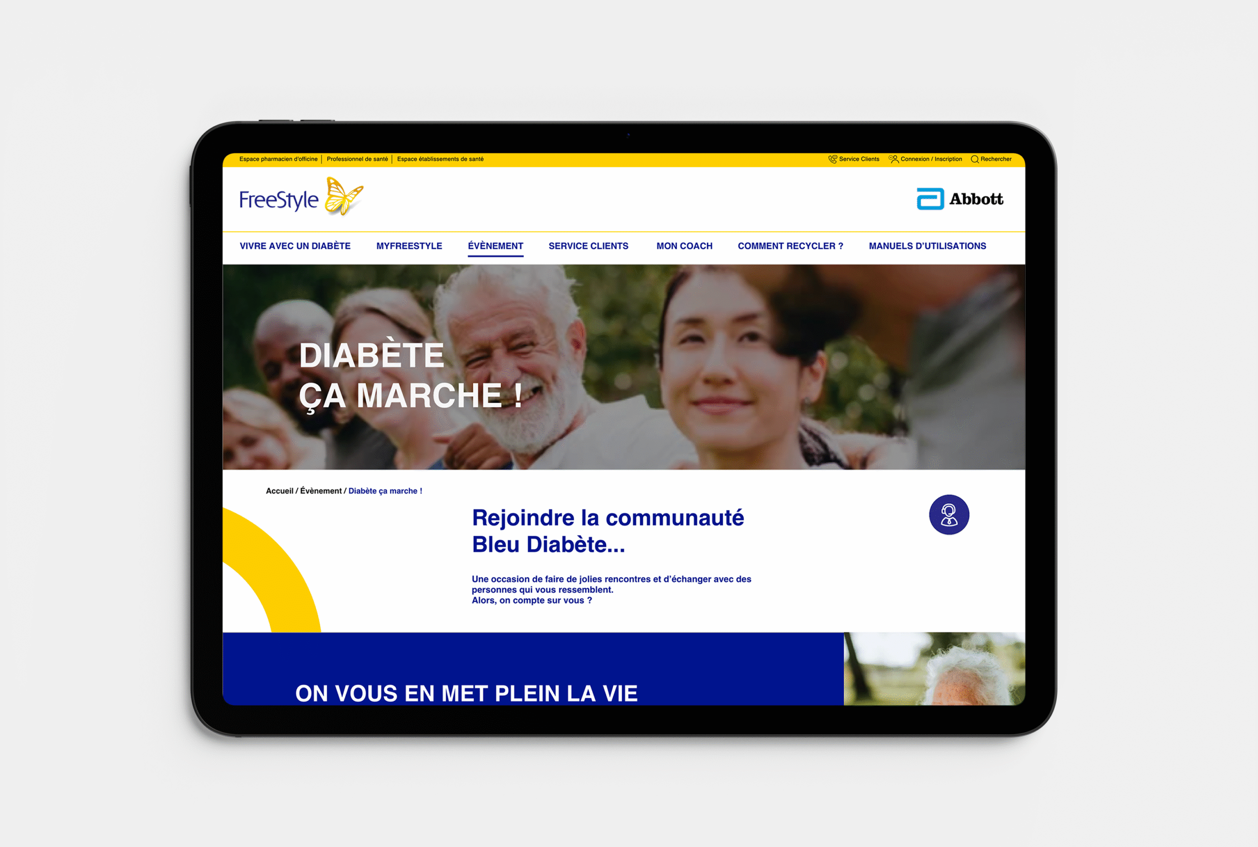 Pour l’événement national Bleu Diabète, j’ai conçu une landing page et une identité visuelle dédiée en m’appuyant sur une démarche centrée utilisateur. L’objectif : créer un support clair, chaleureux et aligné avec la charte Abbott, tout en facilitant l’inscription aux rencontres. J’ai commencé par analyser les besoins : informer rapidement, rassurer, valoriser la communauté et simplifier l’acte d’inscription. Les couleurs bleu et jaune, issues de la charte Abbott, ont été retenues pour assurer cohérence, lisibilité et continuité de marque. J’ai développé une identité visuelle tournée vers le mouvement et l’accompagnement : Formes courbes pour évoquer la marche et la fluidité . Photographies humaines pour renforcer la proximité et l’inclusion ; Iconographie simple pour clarifier les trois activités (balade, atelier, partage). La structure de la page a été pensée pour guider progressivement l’utilisateur : Message d’ouverture engageant. Présentation du programme avec un découpage clair. Visualisation rapide des prochaines rencontres. CTA visibles et répétées pour optimiser les conversions. J’ai appliqué une hiérarchie typographique lisible, une mise en page aérée et un rythme visuel permettant une compréhension immédiate. Le design intègre l’univers Abbott tout en donnant à l’événement une identité propre, positive et dynamique. Résultat : une landing page cohérente, engageante et accessible, conçue pour informer, rassurer et convertir en quelques secondes.